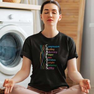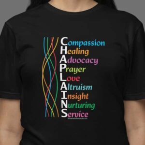 Not everyone knows what chaplains do or what qualities they bring to their work. This shirt lets people know that chaplains bring Compassion, Healing, Advocacy, Prayer, Love, Altruism, Insight, Nurturing and Service to their interactions with the people they serve. These spiritual qualities are represented by the spiral colors running up the side of the design.