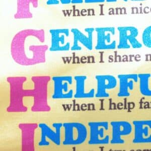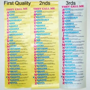 This colorful wall hanging uses child-friendly definitions to help kids understand what positive character qualities look like in action. These seconds are bulk-priced for giving to classrooms or children’s classes. CLICK HERE to order the first-quality version for your own use.