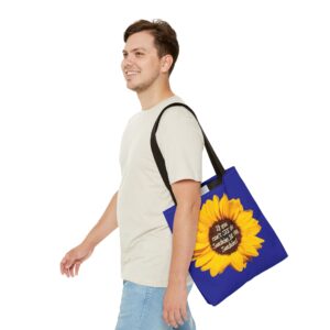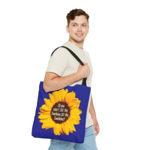 This handy tote bag says “If you can’t see the sunshine, Be the sunshine” on BOTH sides. The sunflower came from our garden and was photographed here in our yard. The all-over print with the rich cobalt blue background really makes the flower image pop. Made from heavy woven polyester, so it will last for many seasons.