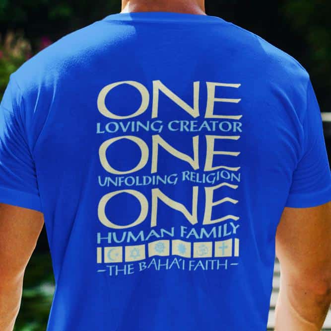 The front says “Celebrate Oneness” and both the front and back include the symbols of six major religions. The back also says “The Baha’i Faith” – making it one of our best teaching shirts.