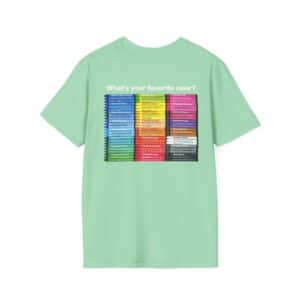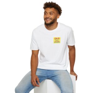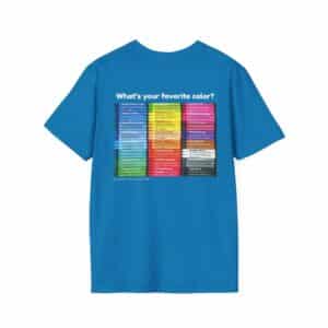 On the front of the Saphire, Coral Silk, Mint Green and Cherry Red is a crayon box with the words “Color your life with Character.” The crayon box is smiling. Since these four colors are two-sided, they costs a little more than the White, Light Blue and Purple shirts. Choose your shirt color accordingly.