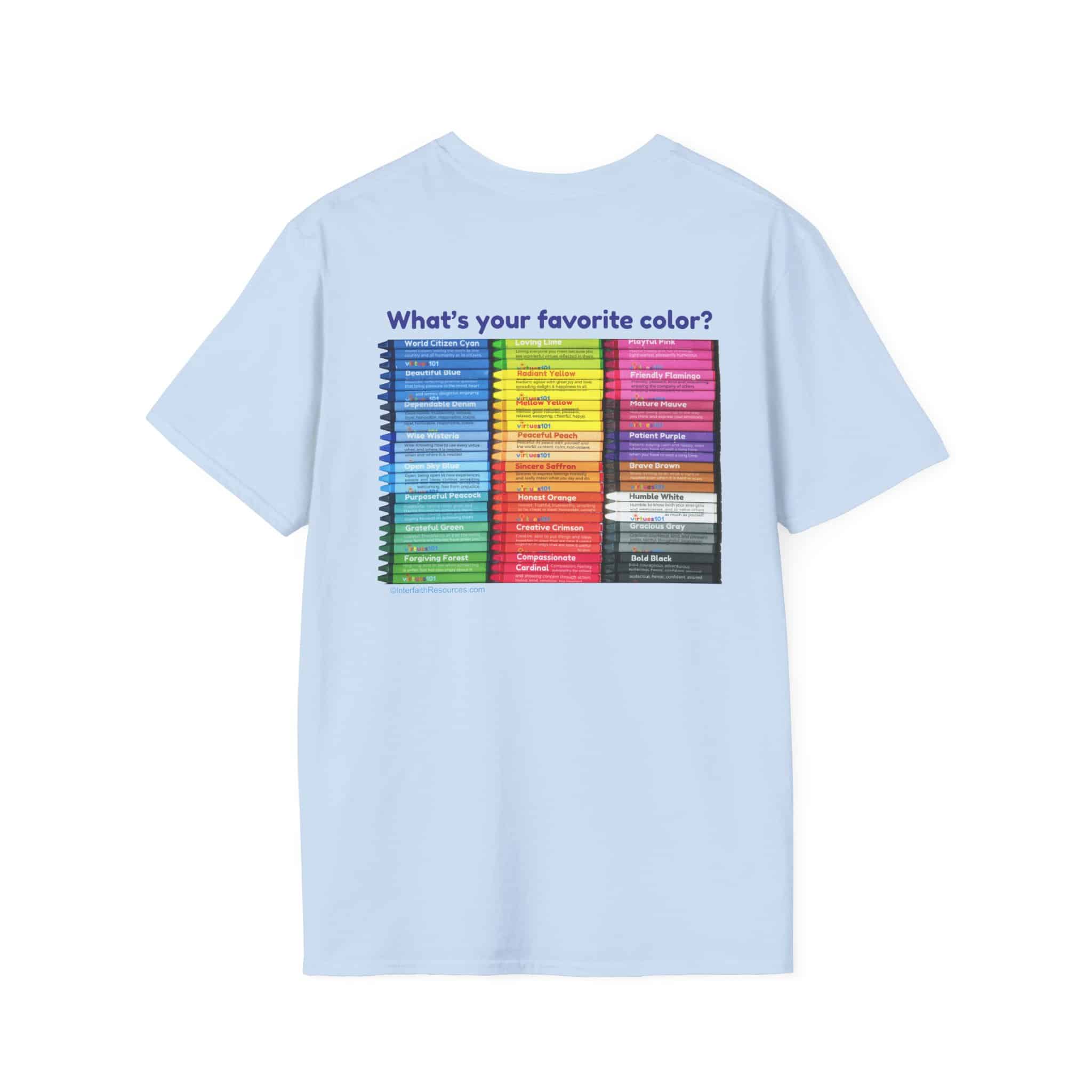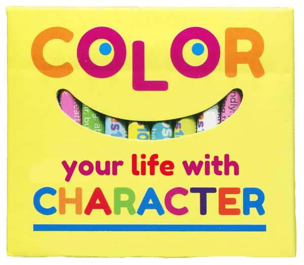 “Color your life with Character” is a great conversation starter. The back of the T-shirt is a picture of our Color with Character crayons, with the question “What is your favorite color?” Everyone who sees it will instinctively look for their favorite color in the picture of crayons, only to discover that it has been renamed after a virtue! The name of the color and a brief definition of the virtue – such as “Forgiving Forest” or “Compassionate Cardinal” – will give them much to think about.