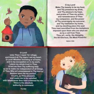 Crown My Head is newer, so fewer Baha’i children have it on their bookshelf. It is beautifully illustrated with pictures of diverse children in bold colors that will attract the interest of young readers. It is 24 pages with 12 prayers that are appropriate for young children. It is has a stapled binding, so it lays flat for reading, but it looks like it is perfect bound. It is 5.5×5.5 square.