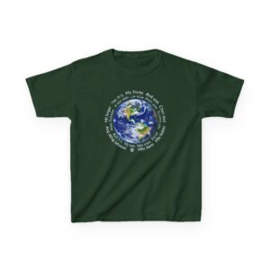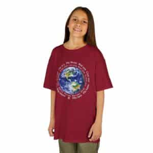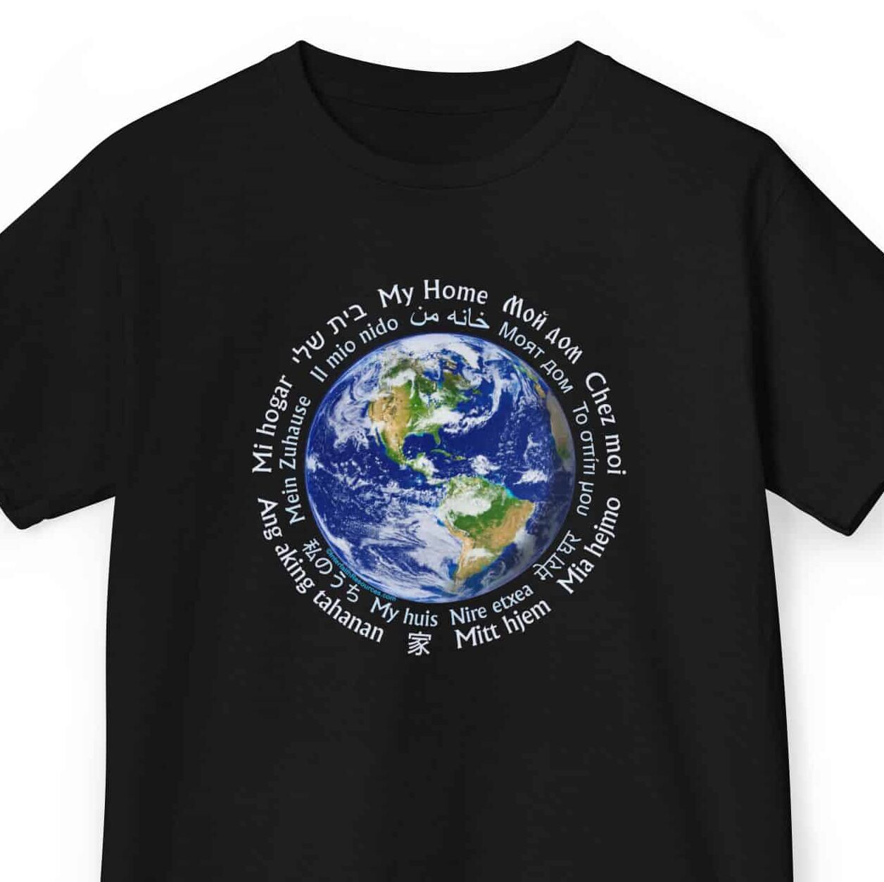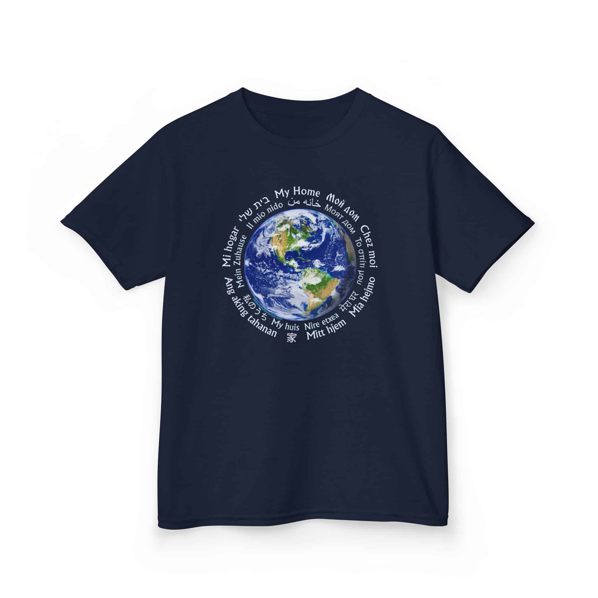 This shirt makes that point eloquently, with a beautiful picture of the earth from space, surrounded by the words “My home” in 18 different languages, spanning the globe.