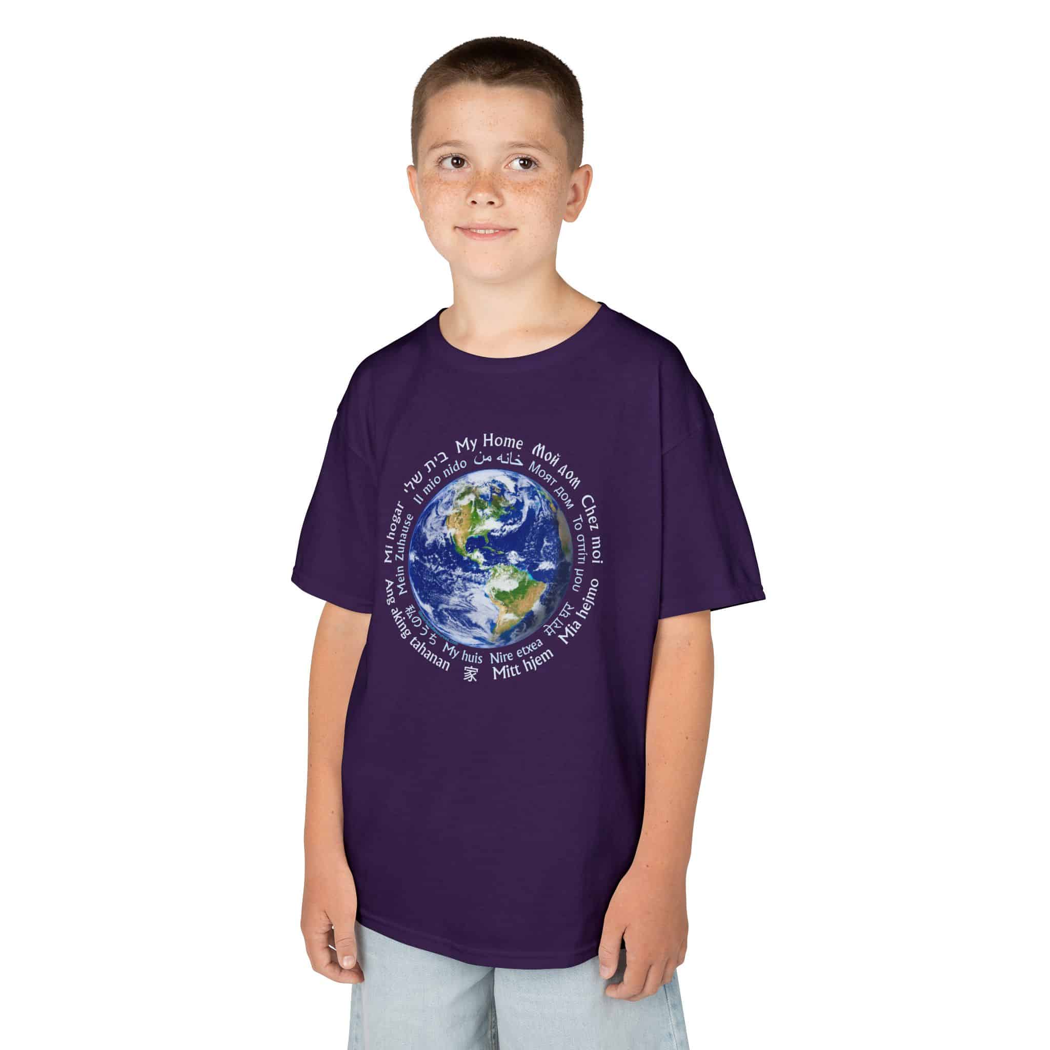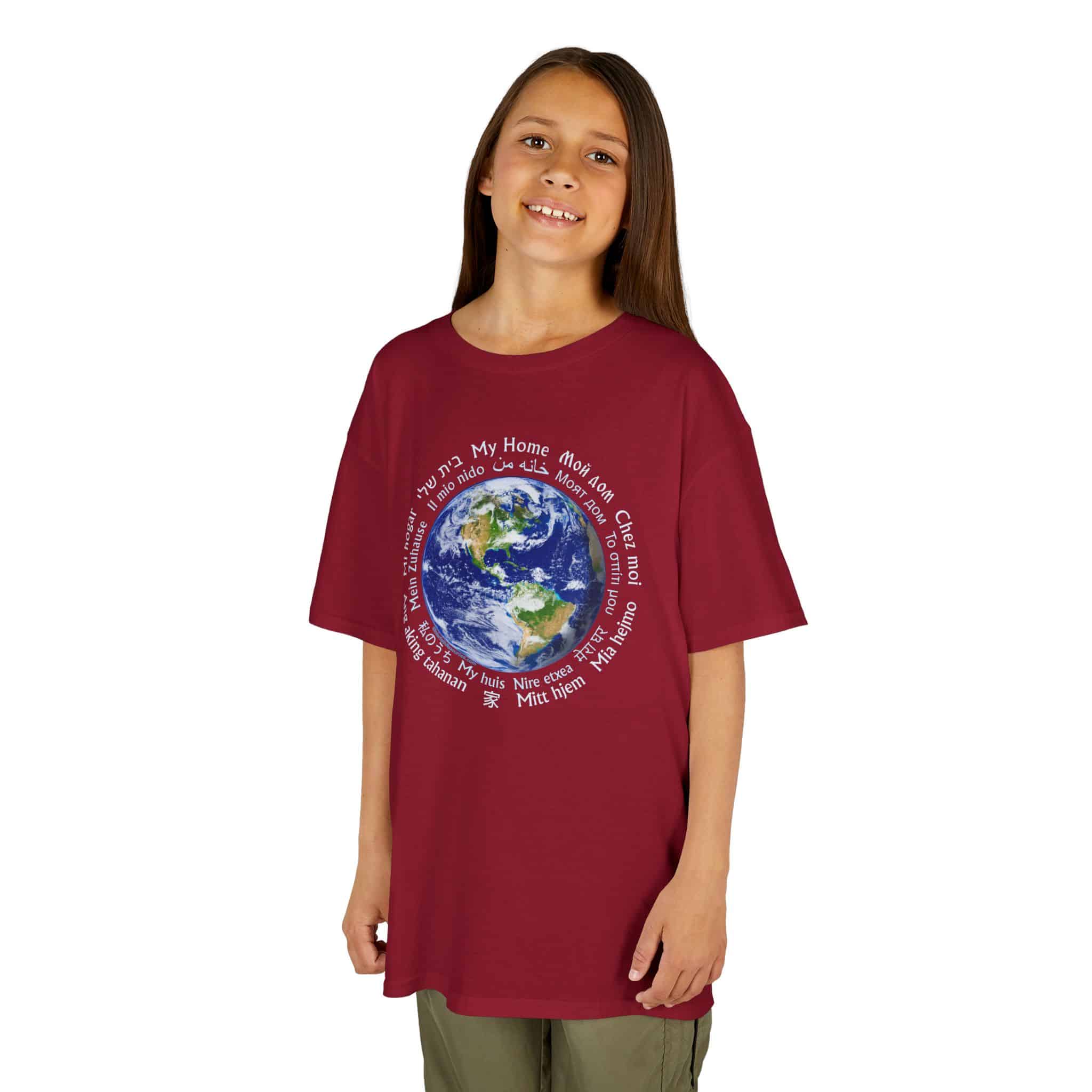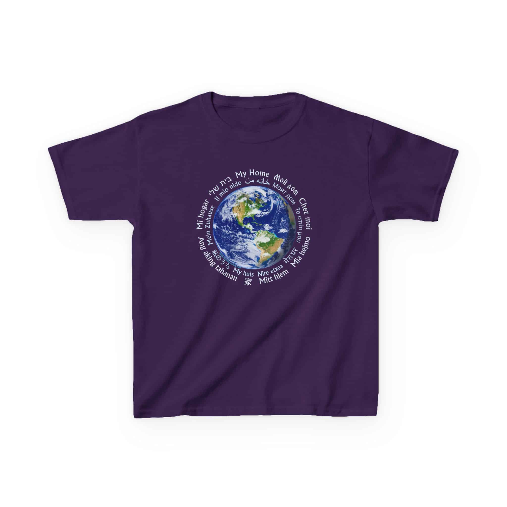This shirt is a great conversation piece at school or on a playground. It is a real challenge trying to figure out all of the different languages used. The nice thing is that they all say the same thing: My Home.
