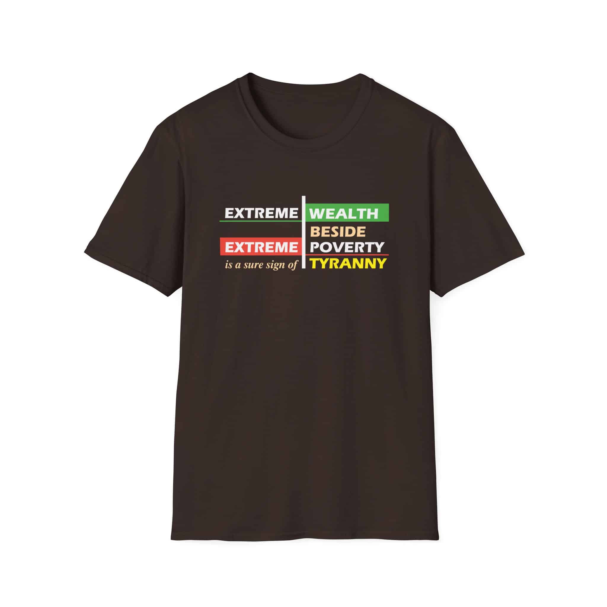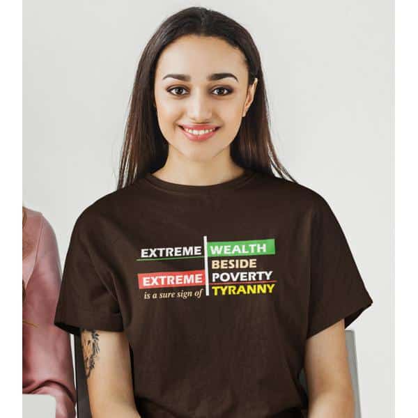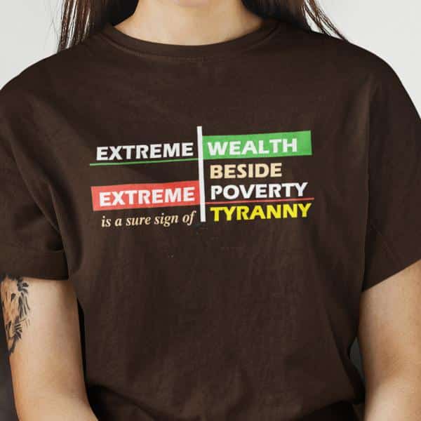 Racism and economic injustice feed on one another. Many of our products address the issues of racism and diversity, but few address economic issue. This shirt points out that extreme economic disparity is a form of tyranny, even if it is fostered in the name of democracy. Industrial slavery is still slavery. When people work a job, but aren’t compensated enough to live comfortably, they are being exploited.