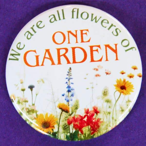 This button illustrates one of the most popular Baha’i phrases with a charming illustration of a diverse garden.