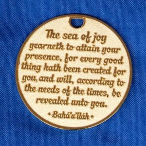 The front is a stylized wave with the word “Joy” under a crescent moon, with a cobalt blue enamel background. The back has the powerful quotation by Baha’u’llah that says: