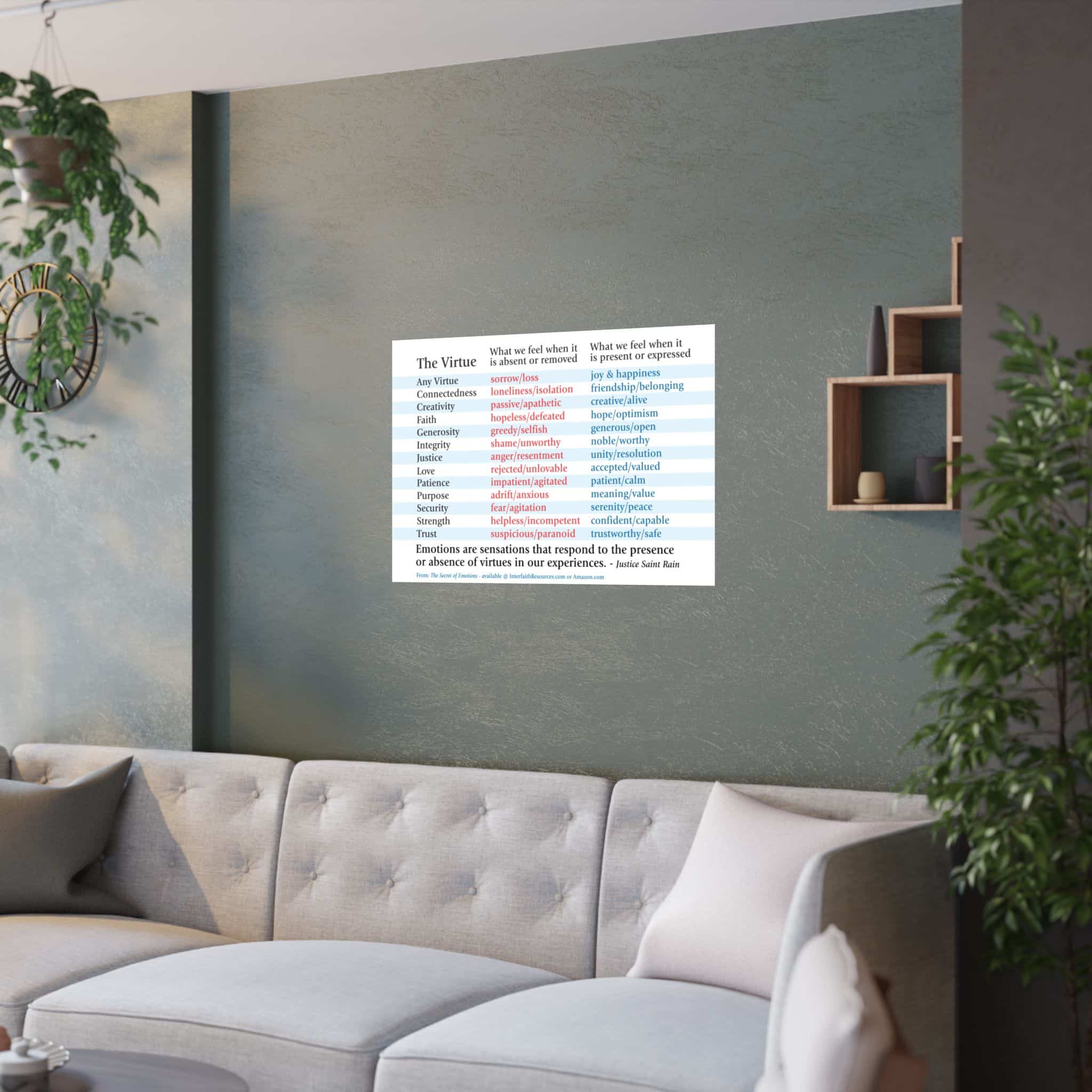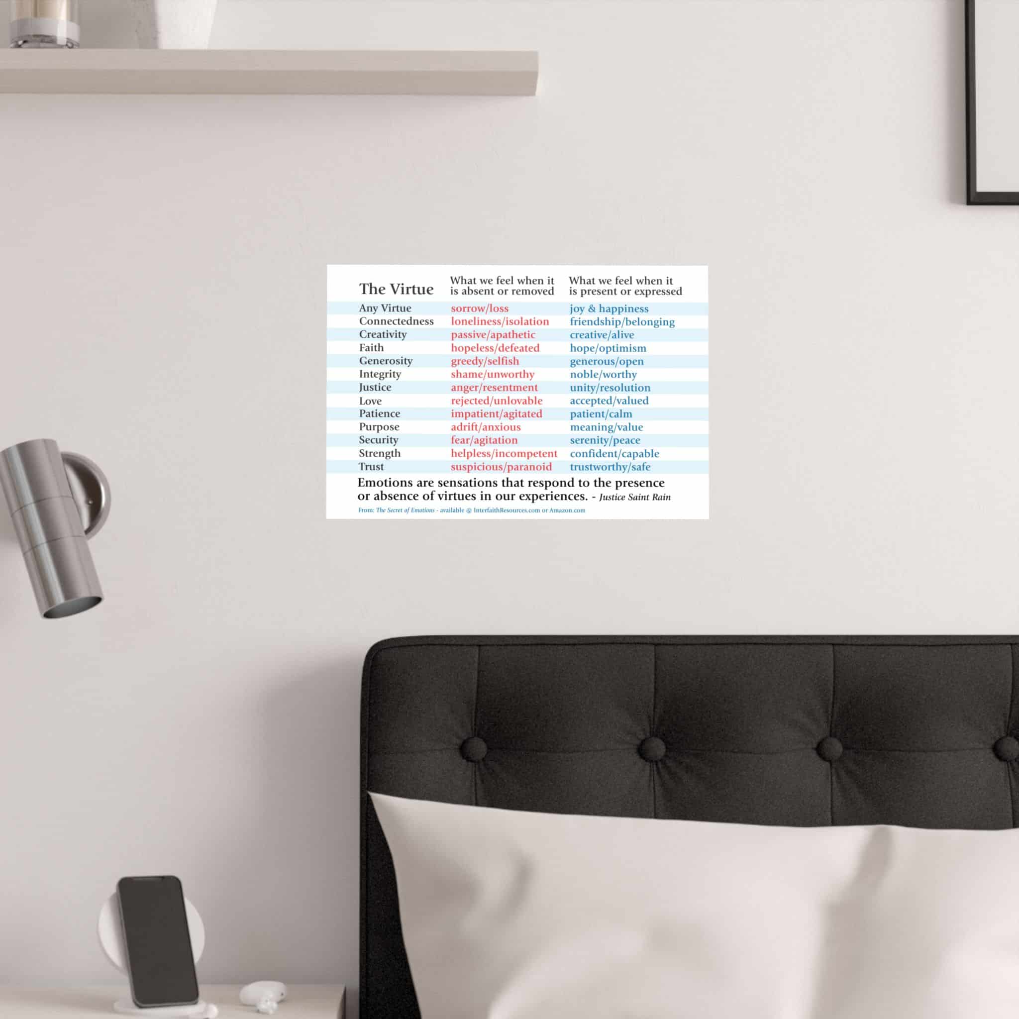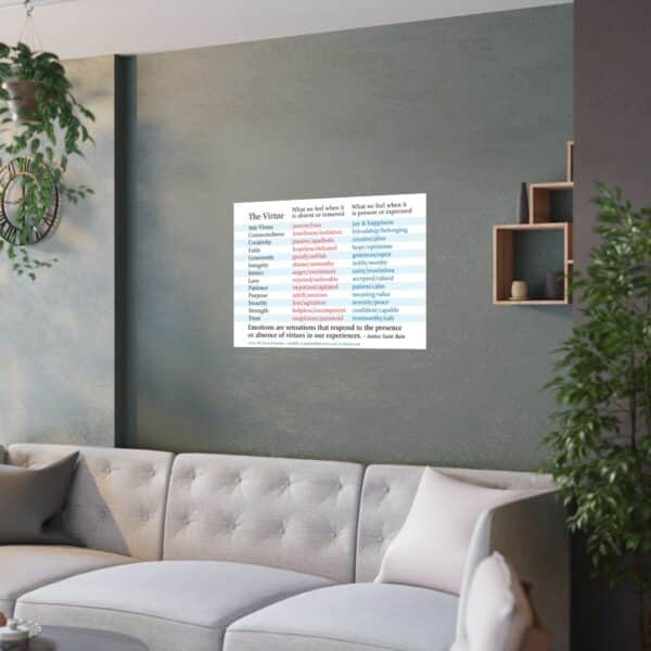 This poster acts as a “cheat sheet” to help you quickly identify the virtue that is either present or absent in a situation, based on the emotions present. It will not necessarily tell you exactly what you need to do in order to resolve a situation, but it will point in the right direction.