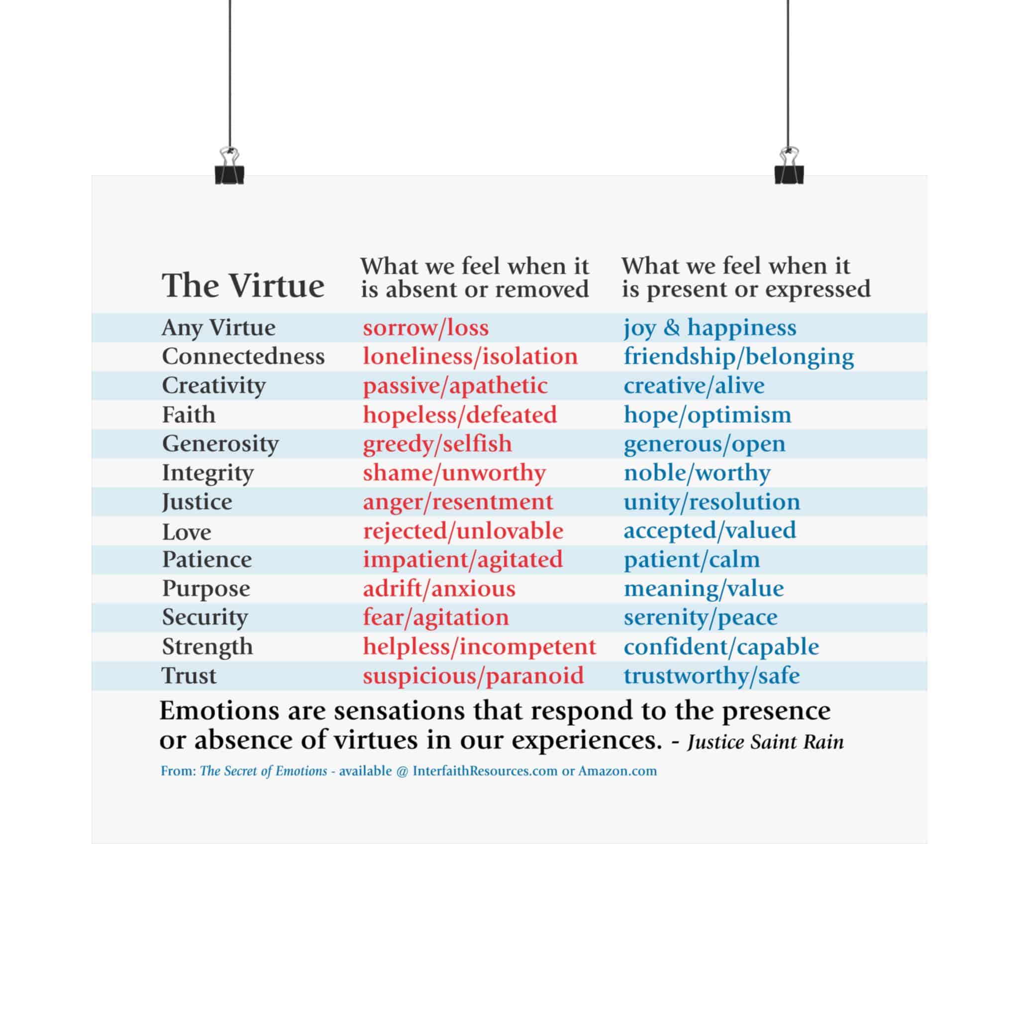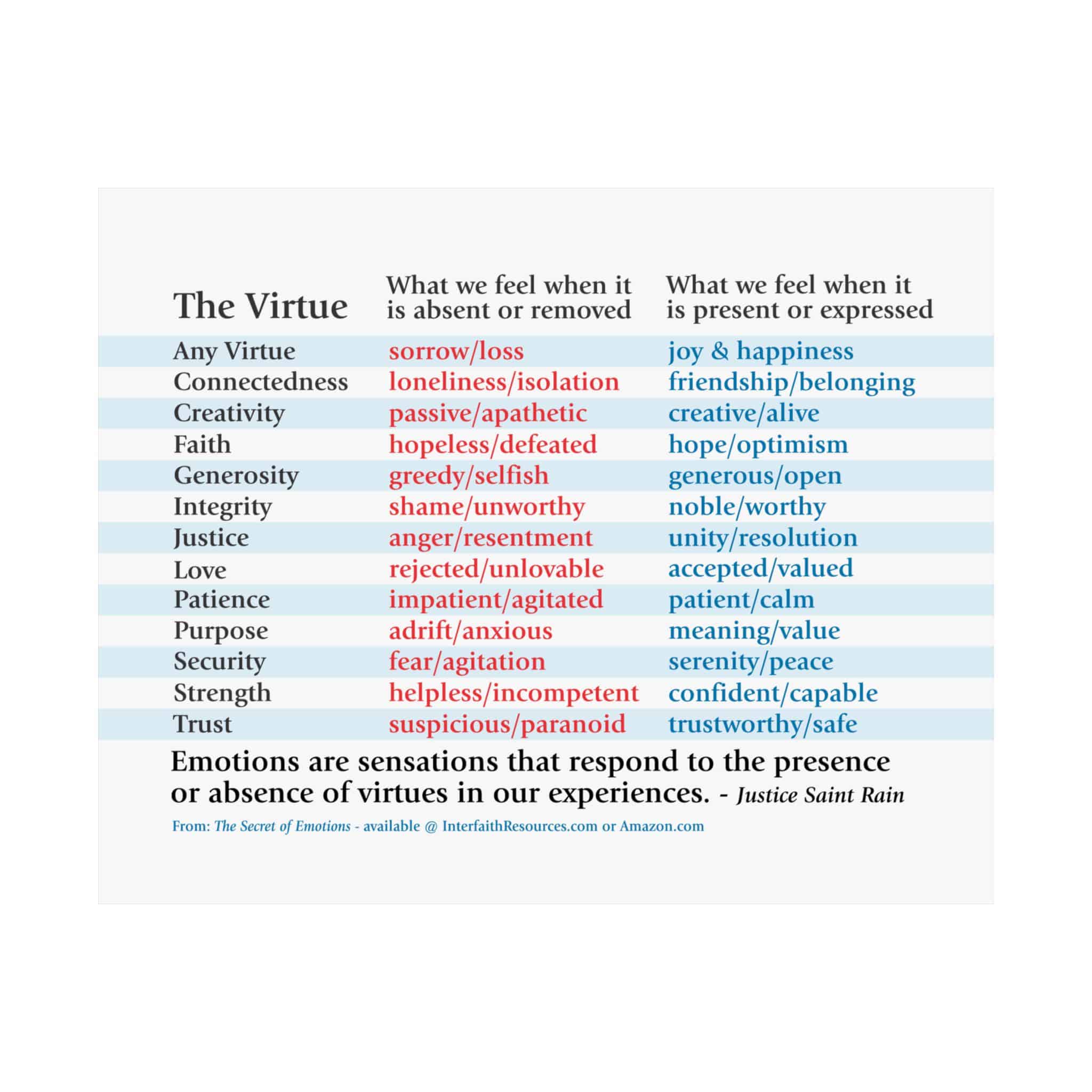 You will find a much more indepth exploration of the relationship between virtues and emotions in the book The Secret of Emotions, available individually or in bulk here and individually at Amazon.
