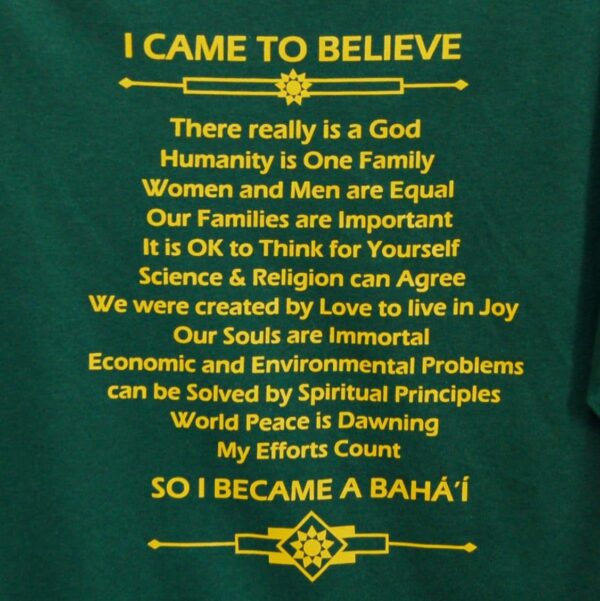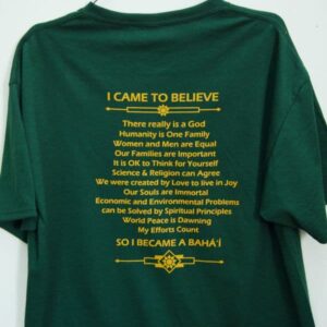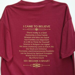 This Baha’i principles T-shirt was the back of our earlier “I’m a Baha’i – Ask Me Why!” T-shirt. Now it is just the back with nothing on the front. It is a great way to teach while standing in line at the grocery story, on vacation, in a park, or any time people are likely to be standing behind you. Unlike the previous version, with the “Ask Me Why” on the front, this can be worn by shy people who want their shirt to speak for them.