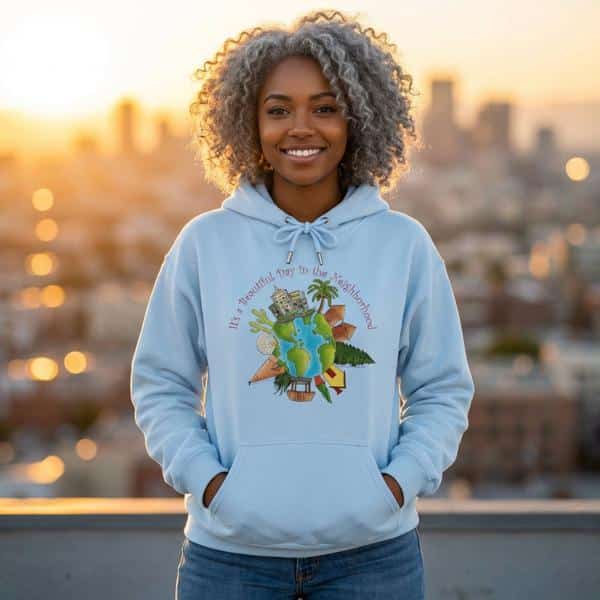 This charming design, using artwork by Charity Elise and a friendly phrase made popular by Mr. Rogers is a cute and subtle way of reminding people that the whole world is one big neighborhood. It combines the sentiments of our “Love Your Neighbor” design with our “World Citizen” and “Earth One Home” designs but with a sweeter, softer approach.