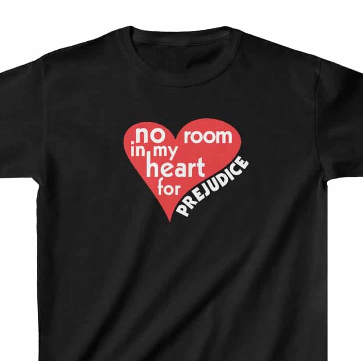This shirt presents the idea of living prejudice-free in a simple bold graphic that is instantly understandable. It coordinates with dozens of our other race unity materials, from yard signs to teaching cards to tattoos.