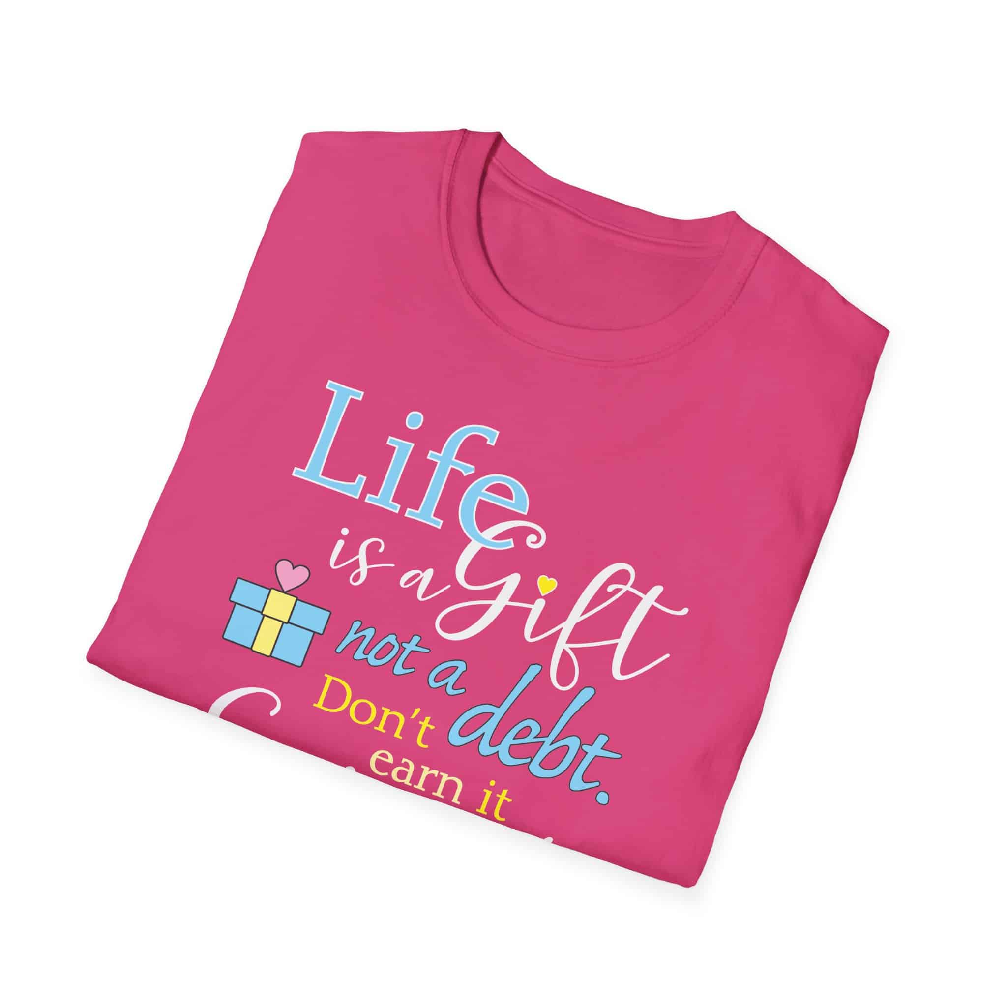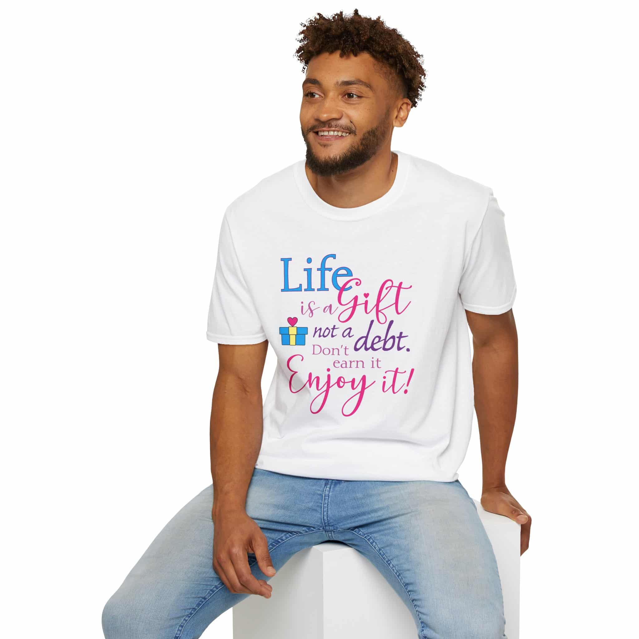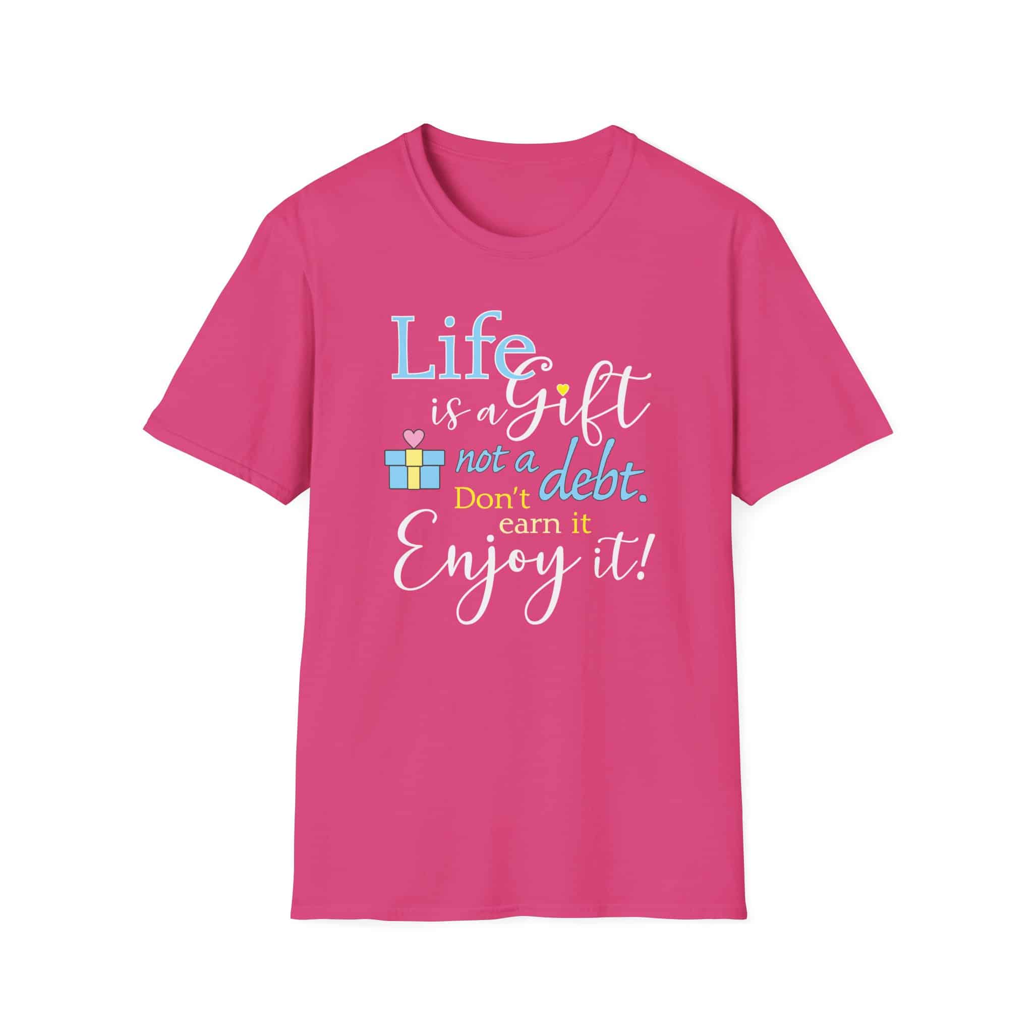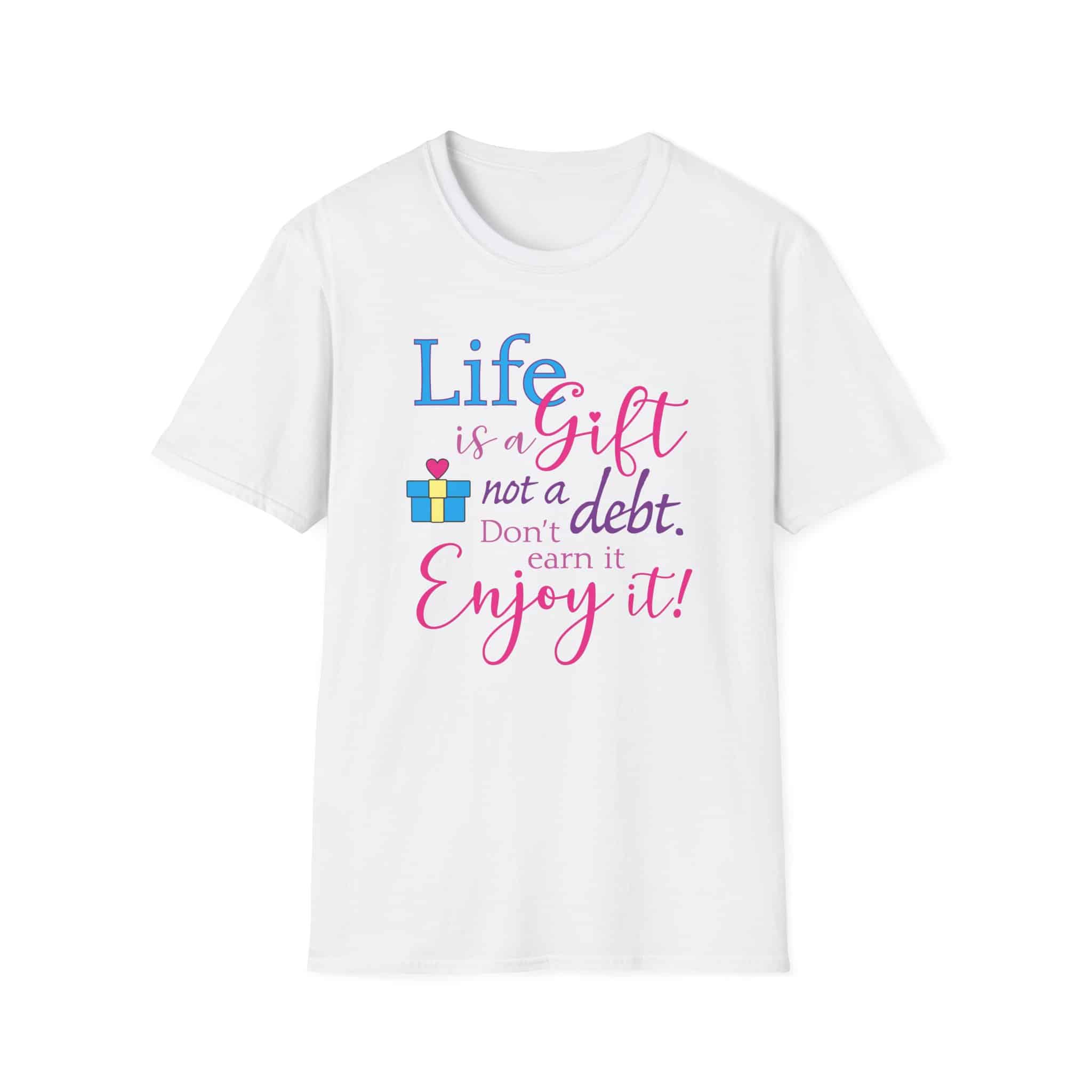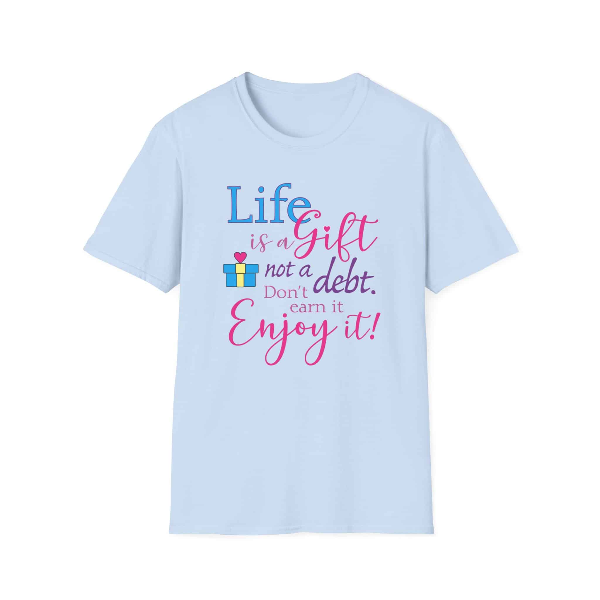 Wear this shirt and spread the word that life is for joy, not guilt; for happiness, not self-abasement. Seeing it just might be what someone needs to let go of the weight of obligation and turn to gratitude instead.
