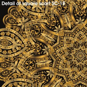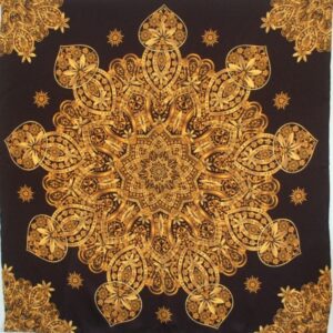 Gold on black is always in style, and this new 9-pointed star design by Baha’i artist Joe Paczkowski really does look like liquid gold on a black background. The soft sheen of the 100% silk satin fabric just adds to the illusion of a beautiful piece of jewelry catching the light from a thousand candles. The smaller 26×26” square size is perfect for a head scarf or kerchief. It is the perfect accessory for someone who likes to wear gold, and the hand-rolled hem means that it meets the gold-standard for quality.