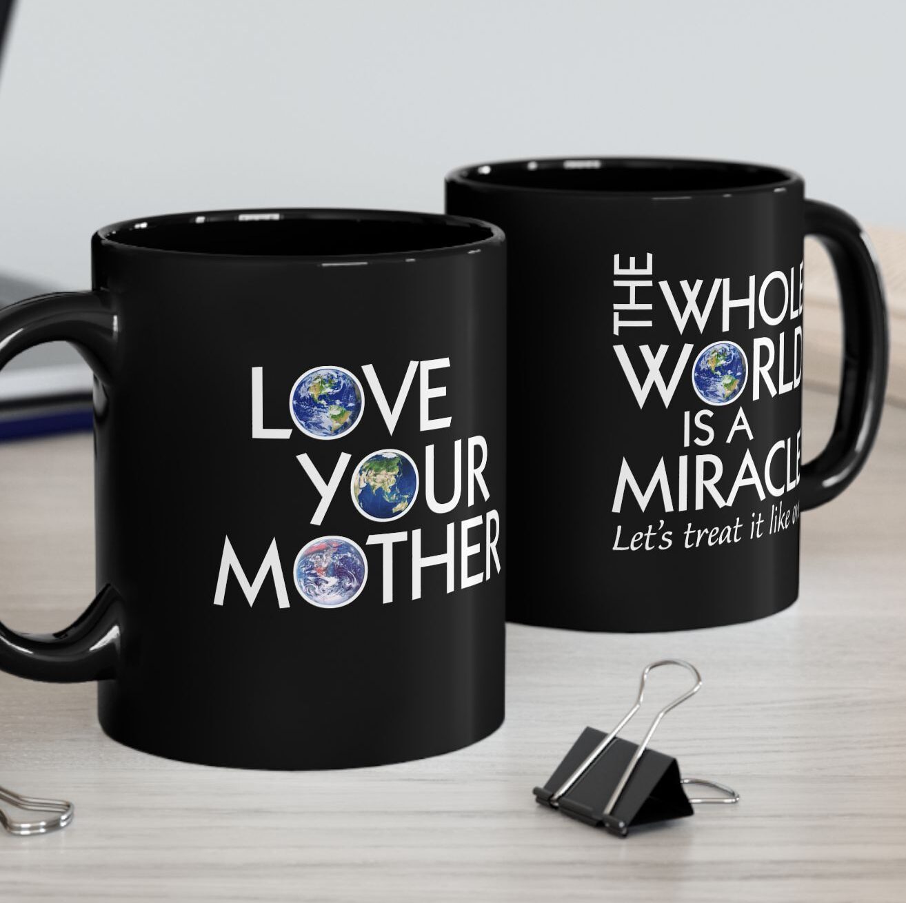 One side says “Love Your Mother” with a picture of the earth inside each of the “O”s, while the other side says “The Whole World is a Miracle – Let’s treat it like one” with the earth inside of the “O” in “World.”