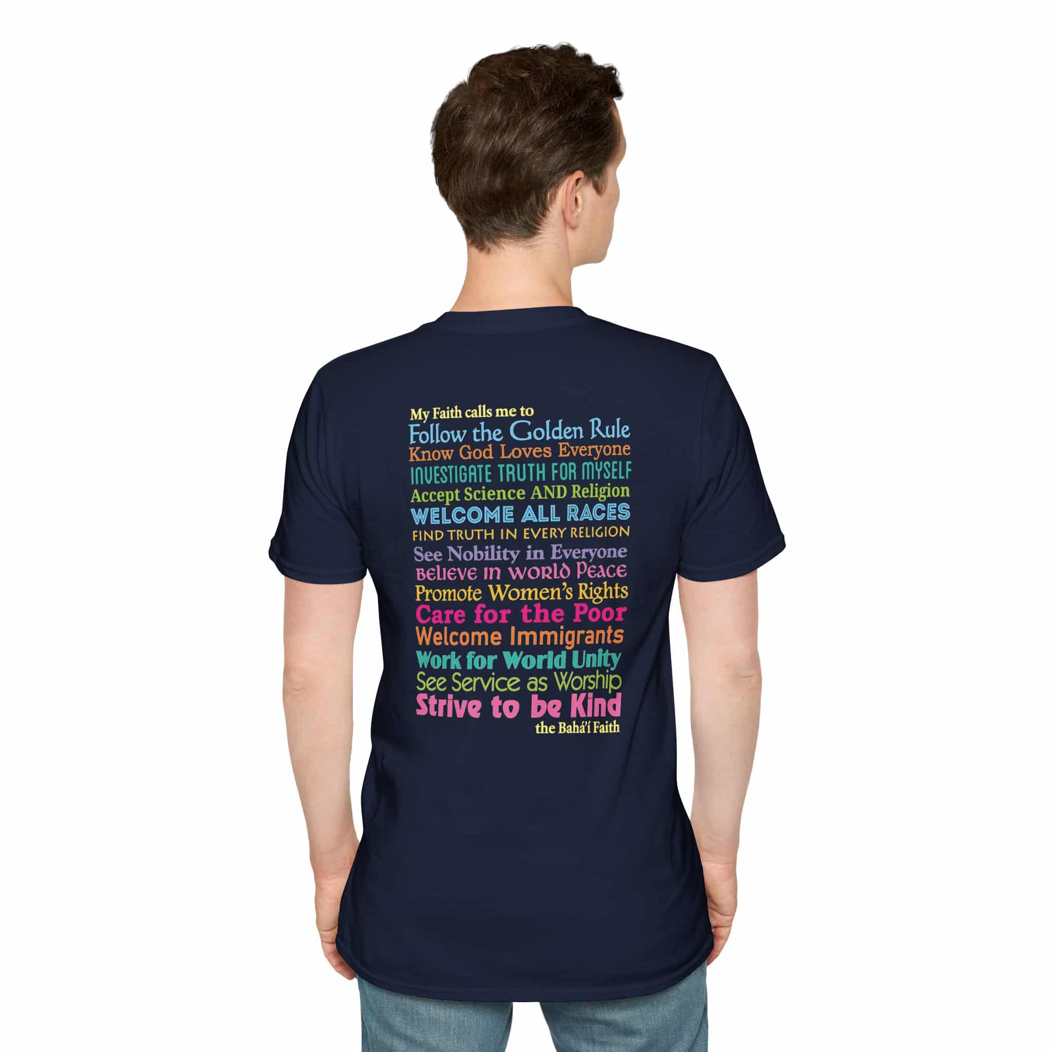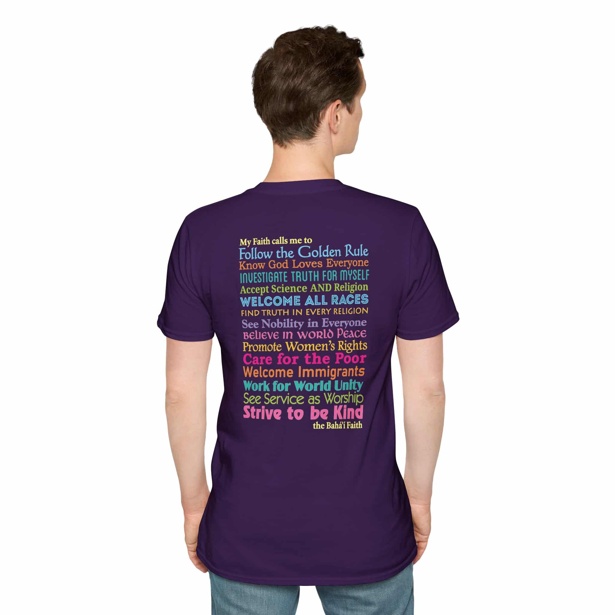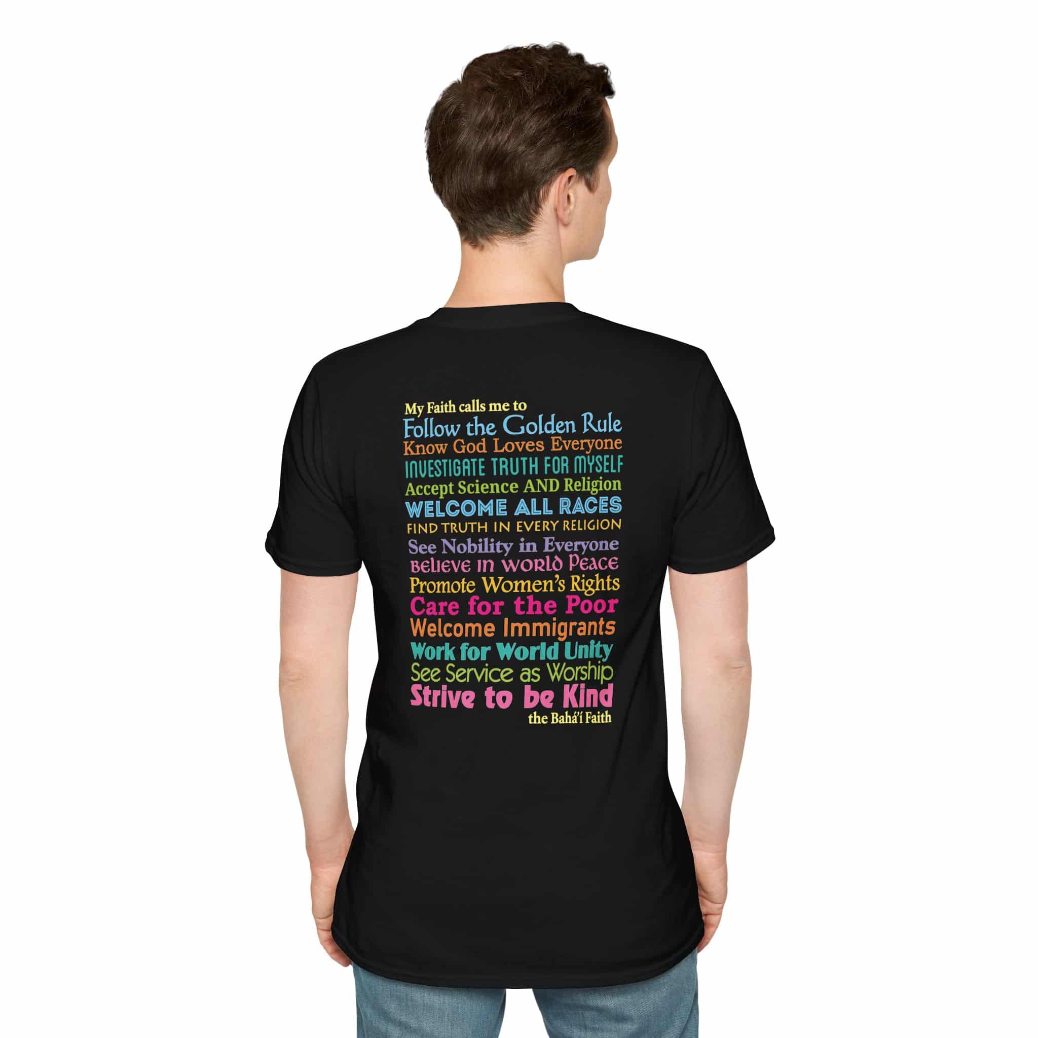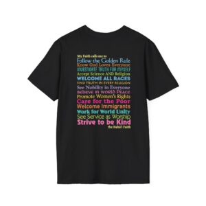 Inspired by our popular yard sign, this T-shirt offers fourteen actions the Baha’i Faith calls us to do – all based on clear Baha’i principles. They are printed on the back in a wide range of colorful fonts to make a visually exciting shirt.
