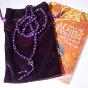 Each set of prayer beads comes with a copy of the Gift of Prayers as well as a fold-out instruction sheet. This contains common prayers, a pronunciation guide and an explanation of some of the many ways to use prayer beads. The set comes packaged in a velvet, drawstring pouch.