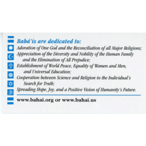 A great card to carry and give to someone for an overview of the Baha’i faith; even room to write your phone number on back.