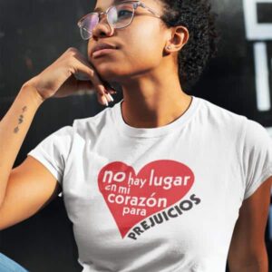 Nuestro diseño más vendido ahora es bilingüe! Ahora disponible en español, dice “no hay lugar en mi corazón para prejuicios” o “no room in my heart for prejudices” en engles. El gráfico es una ilustración ingeniosa de la idea, porque el “prejuicio” no puede meterse en el corazón.