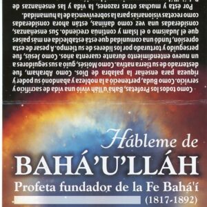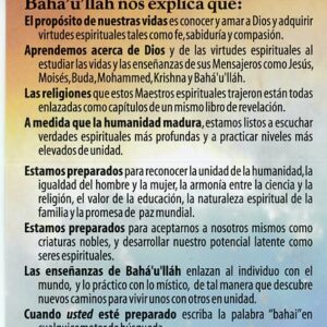 The English version of this teaching card rapidly became one of our best sellers because it compresses an amazing amount of information in an extremely small space. It is also a very non-threatening way to introduce people to the name of Baha’u’llah right up-front. When choosing teaching materials to have translated into Spanish, it was a logical choice. Below is the text in Spanish. To learn what it says in English, click here.