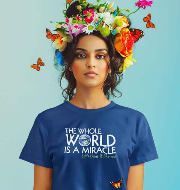 This design adds a spiritual slant to the principle that we should take care of the planet. How would we behave differently – towards each other and towards the planet if we saw it all as one huge and amazing miracle? The picture of the earth in the “O” points towards protecting nature, but the idea that life is a miracle points us all towards the transcendent and lifts our spirits higher.