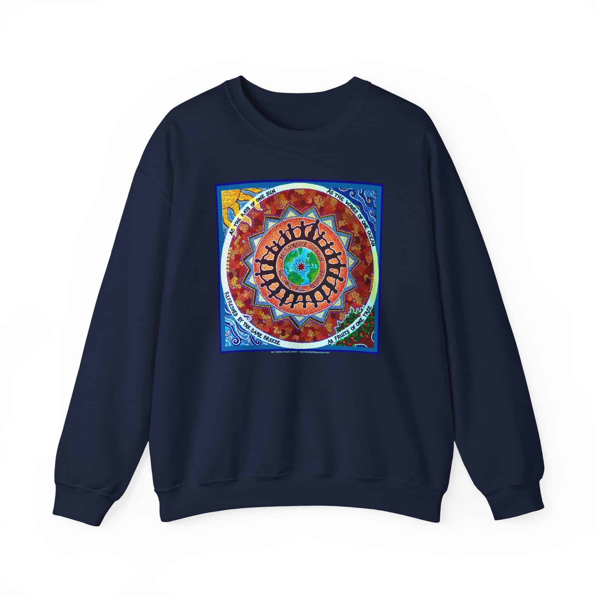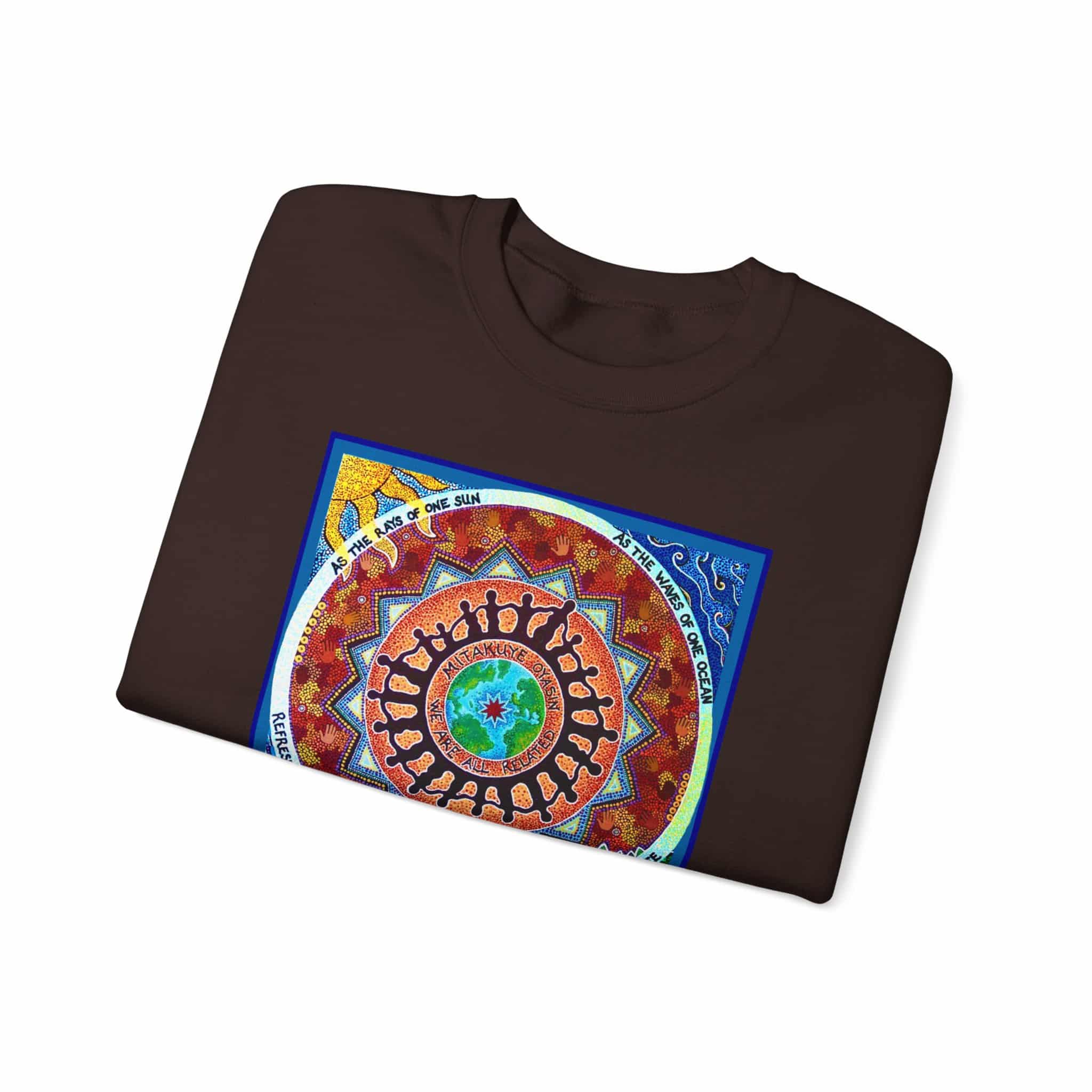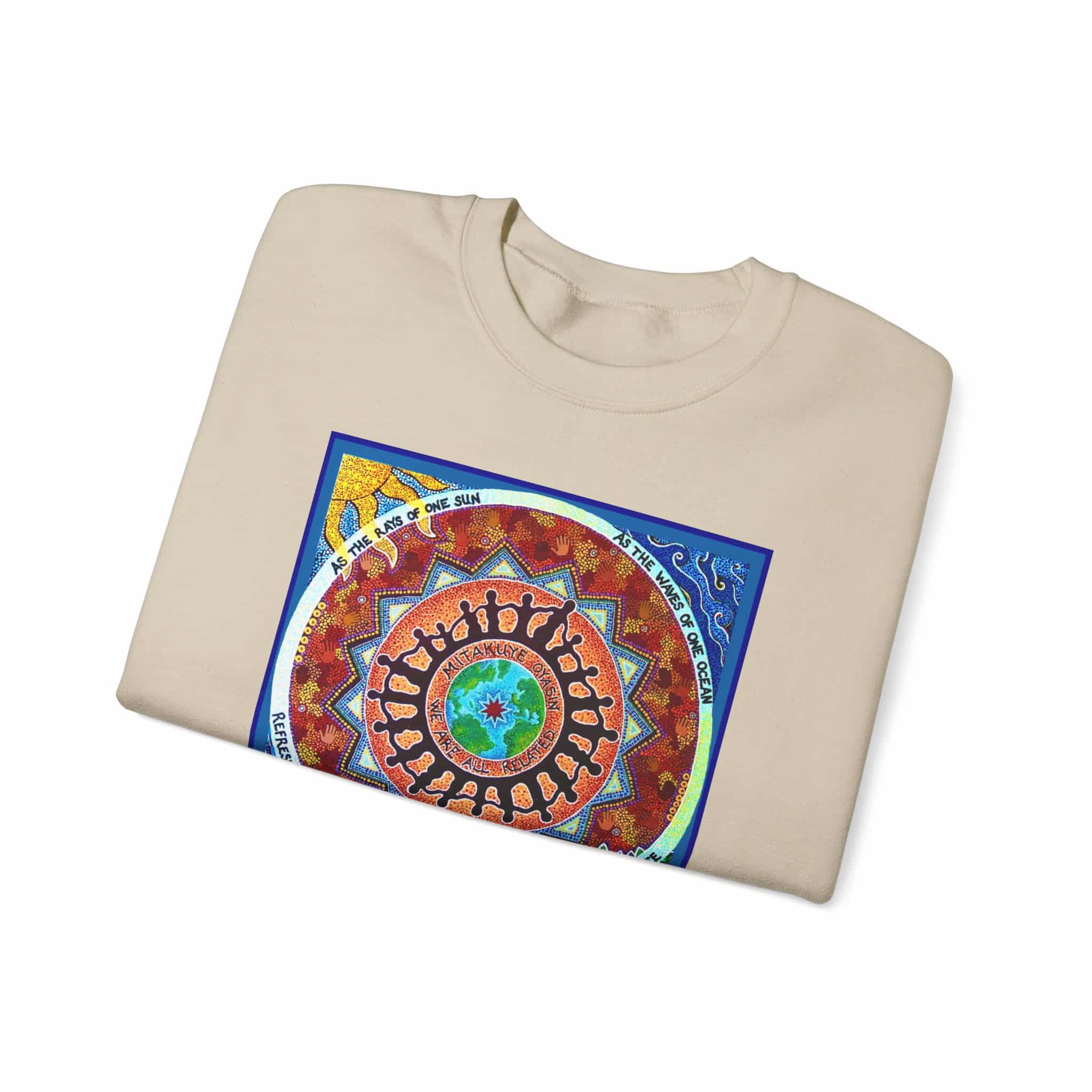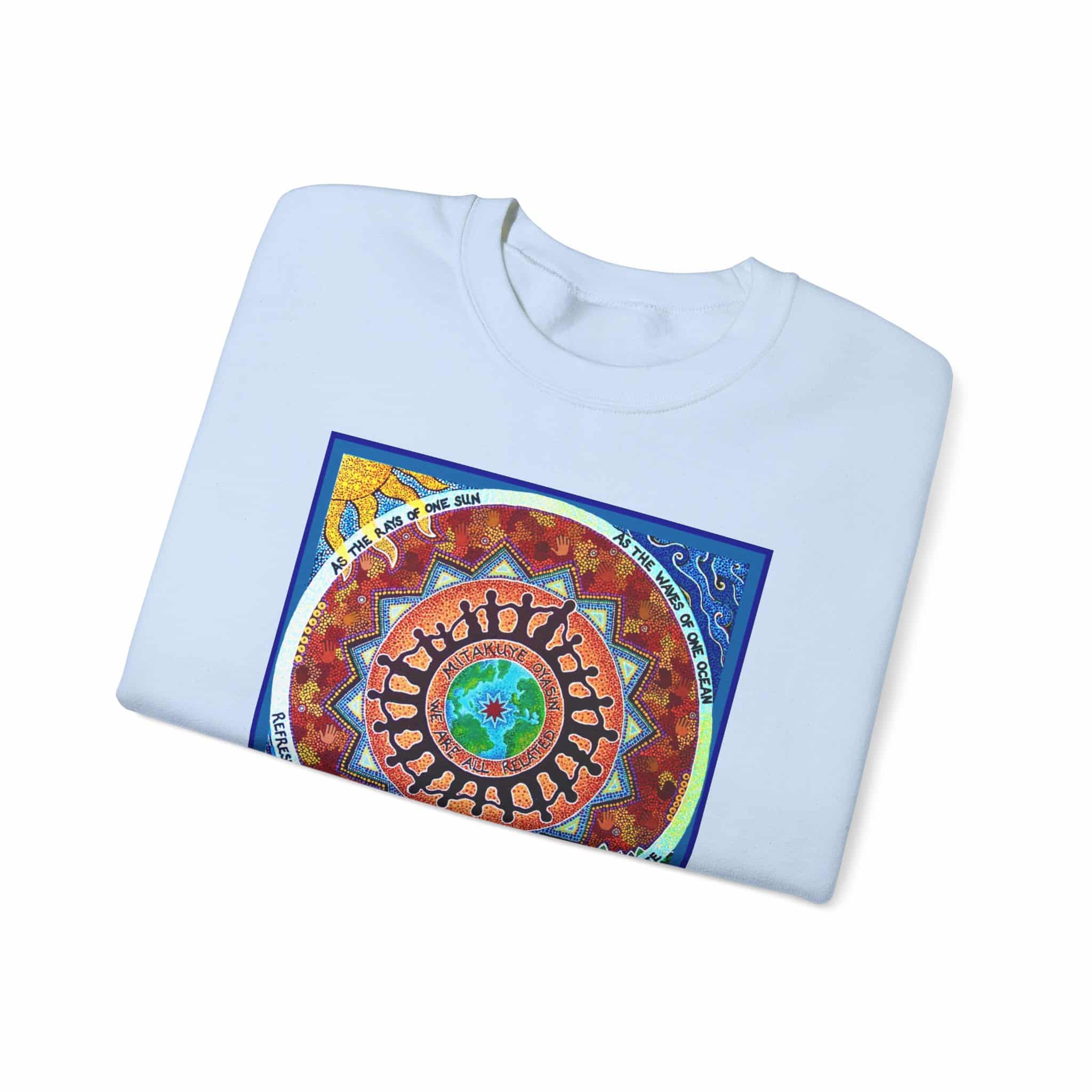 This engaging artwork by Charity Hofert includes the phrase “We are all related” in both English and the Lakota Sioux language. Around the edge it says “As the rays of one sun, as the waves of one ocean, refreshed by the same breeze, as fruits of one tree.”