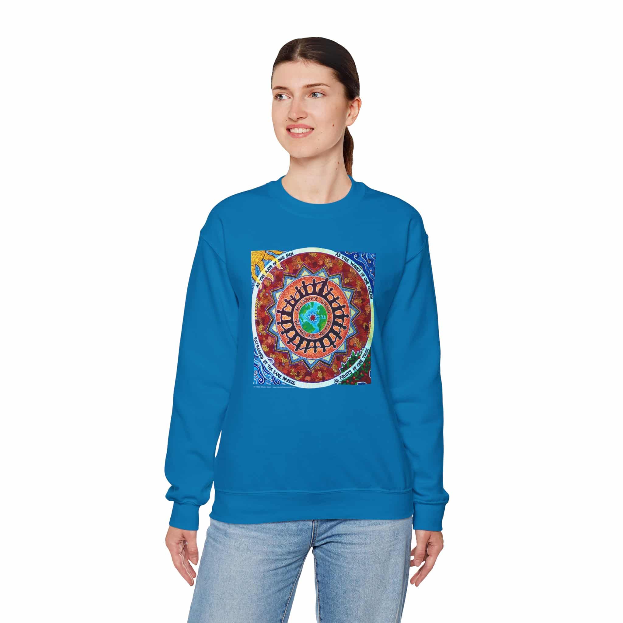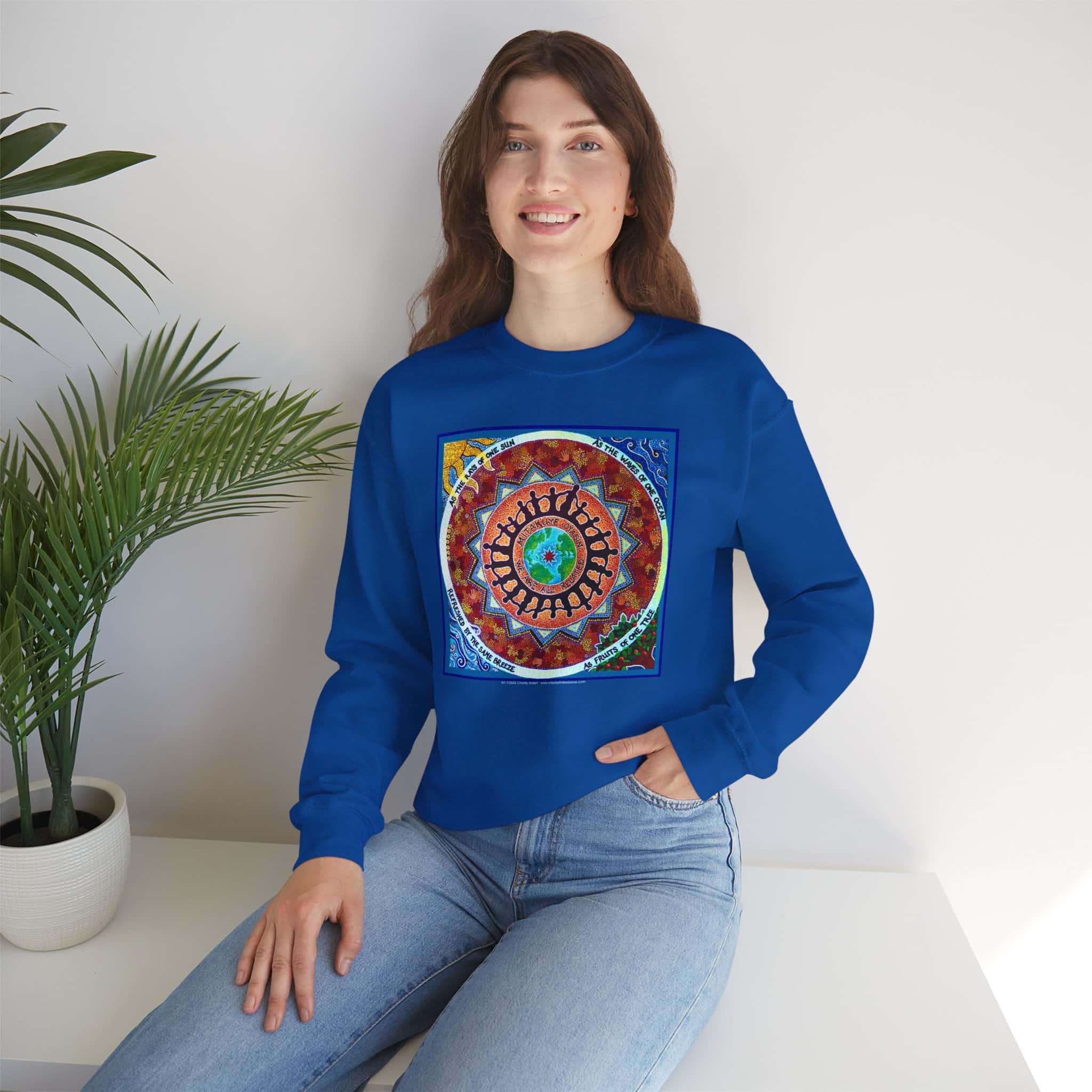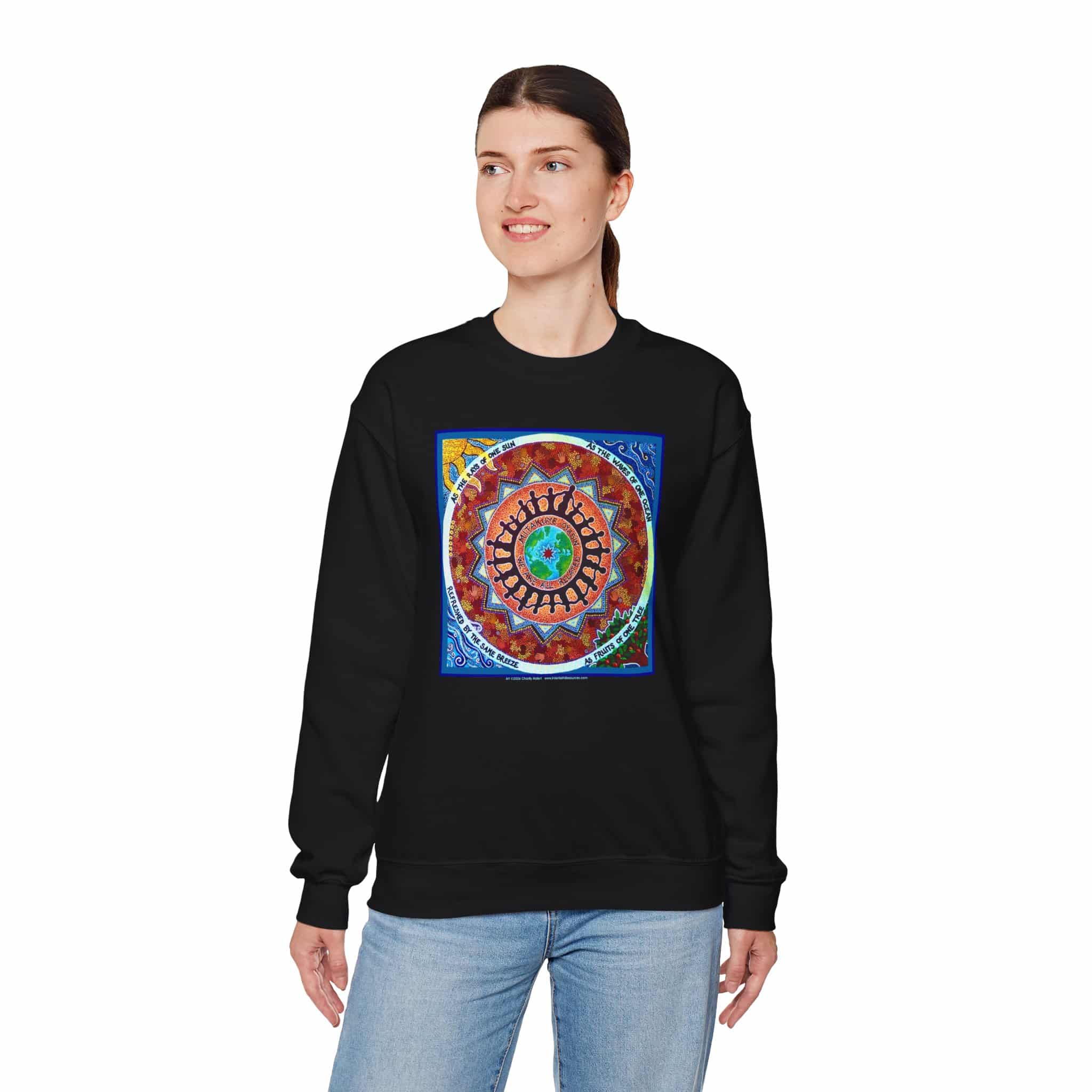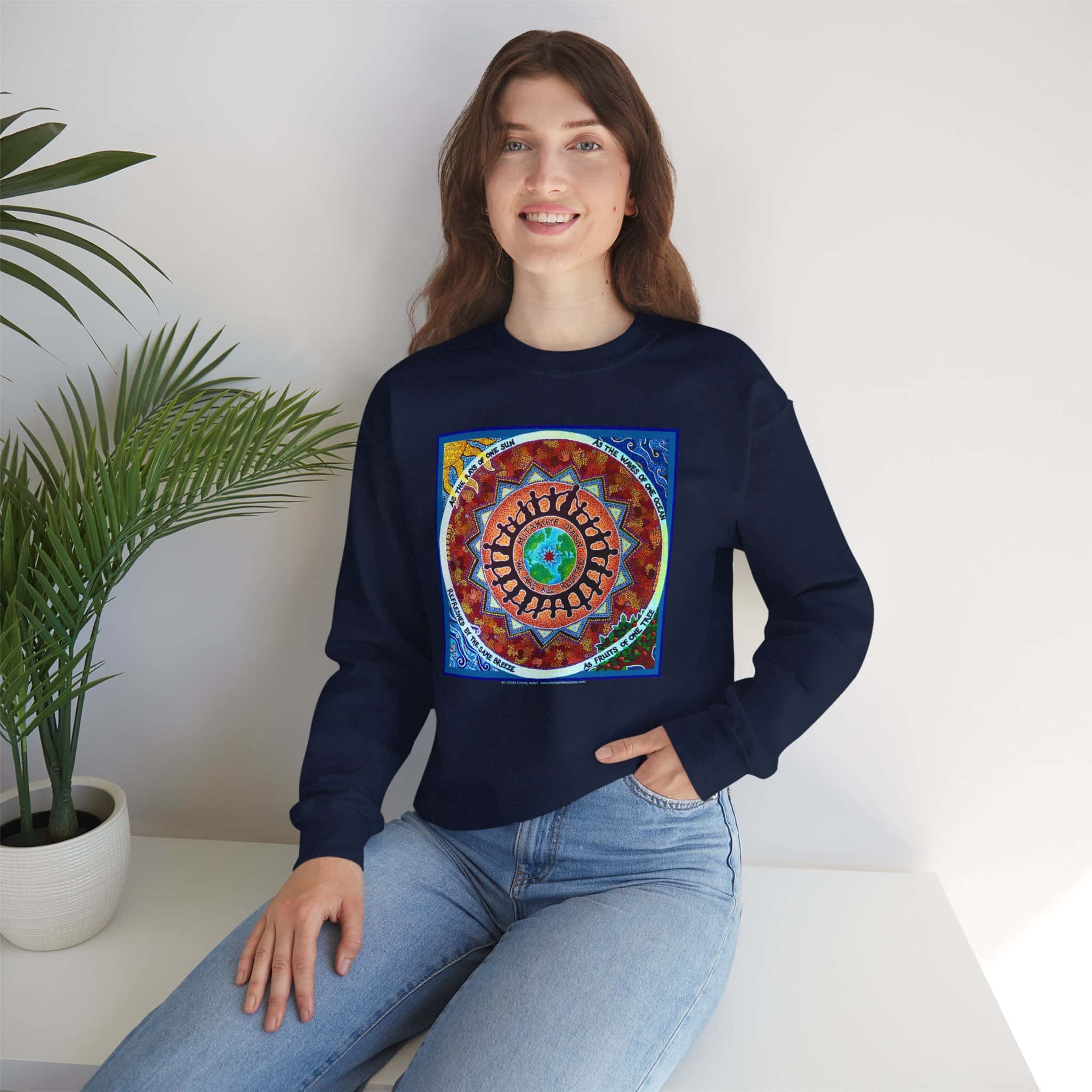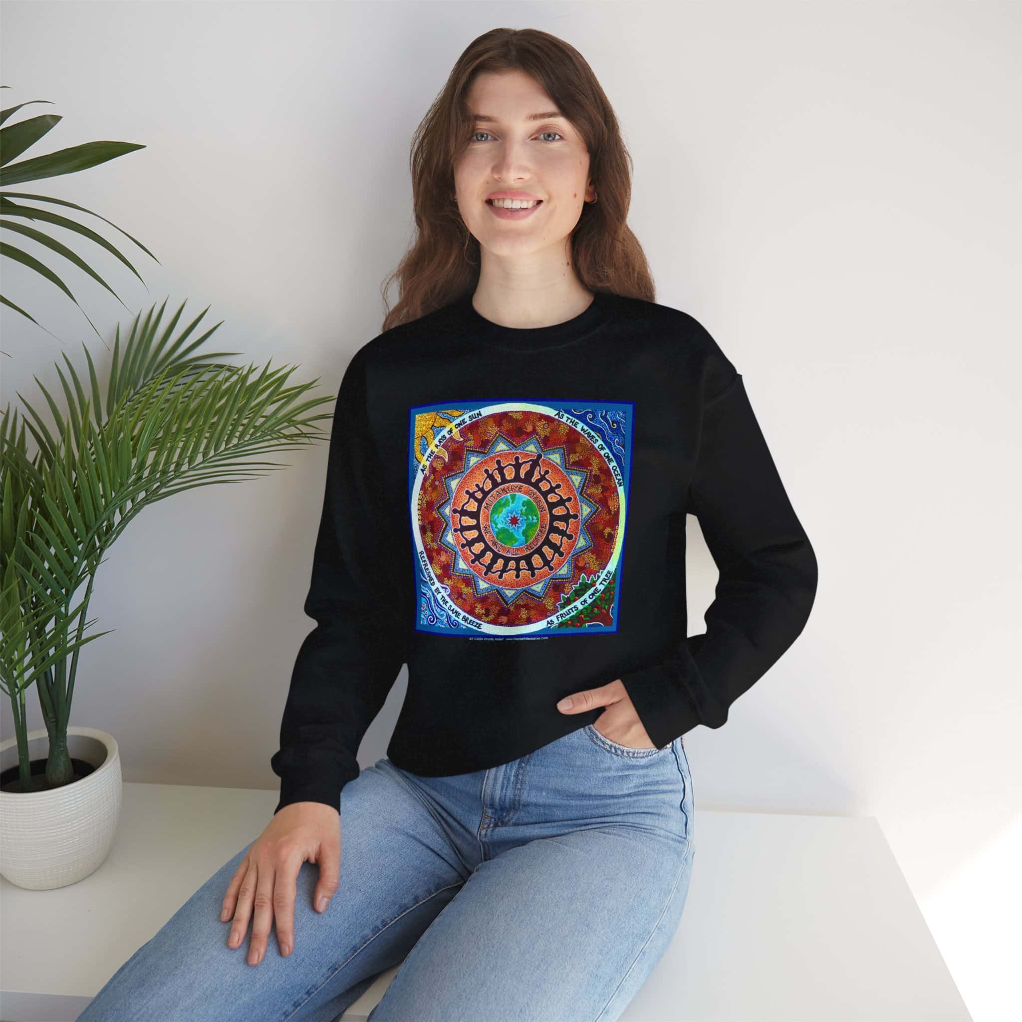 This engaging artwork by Charity Hofert includes the phrase “We are all related” in both English and the Lakota Sioux language. Around the edge it says “As the rays of one sun, as the waves of one ocean, refreshed by the same breeze, as fruits of one tree.”