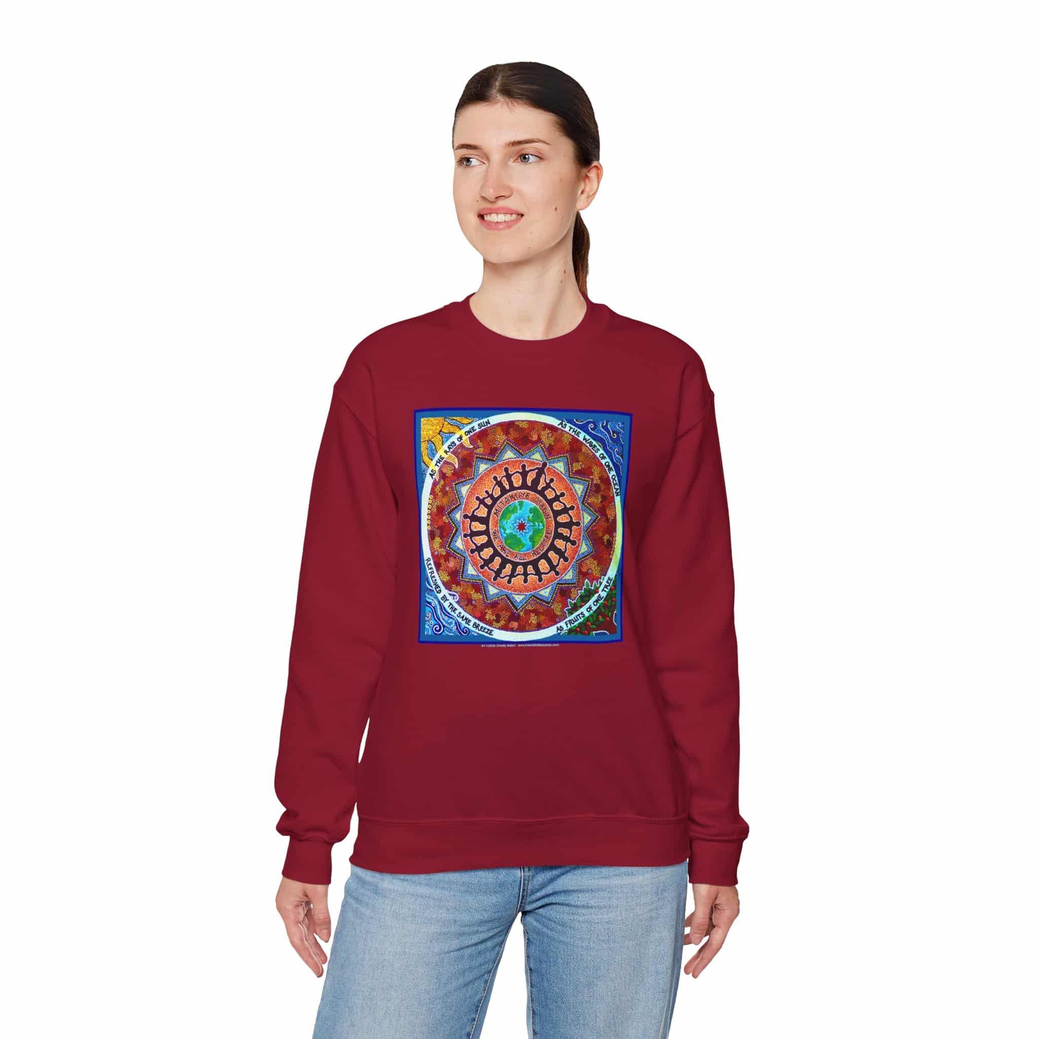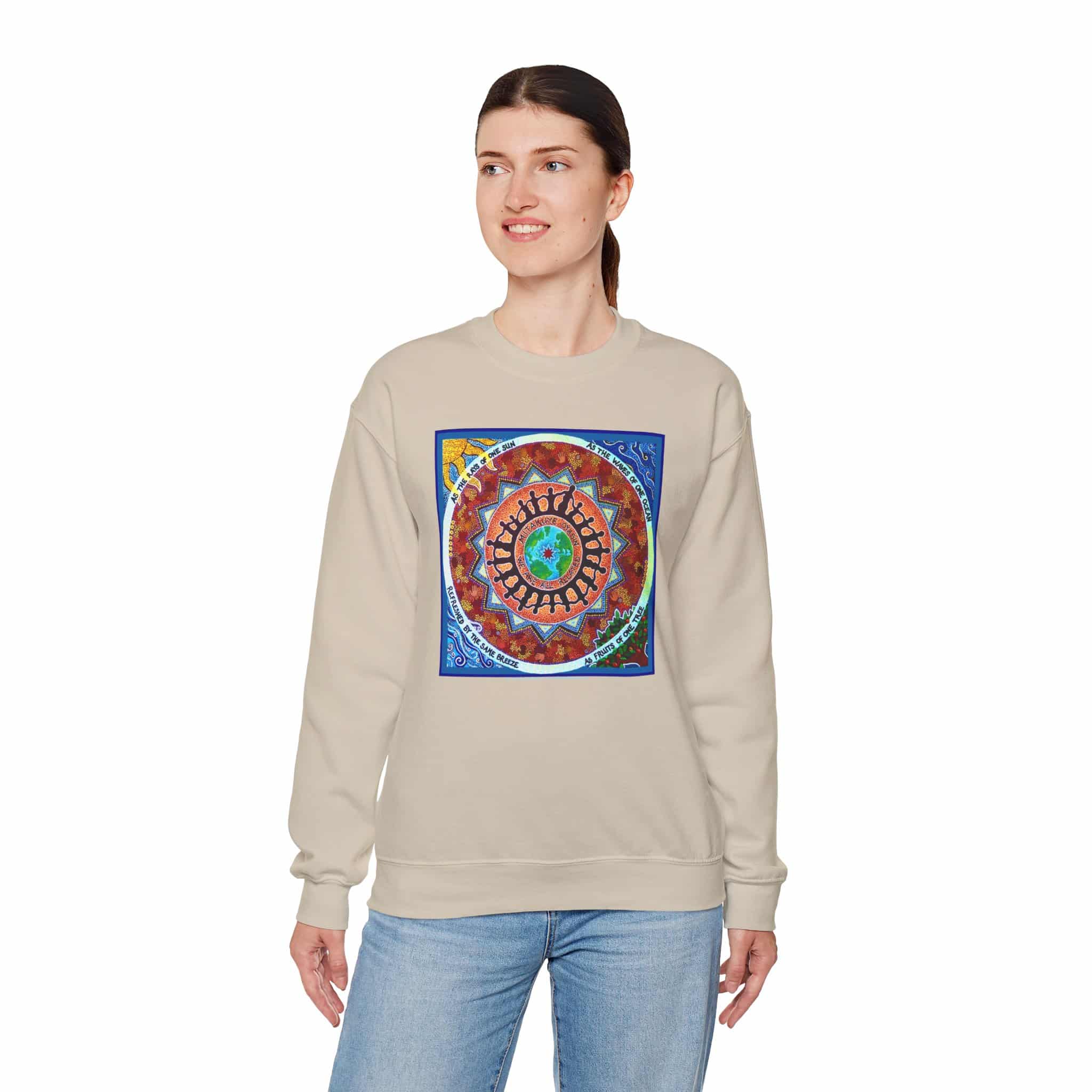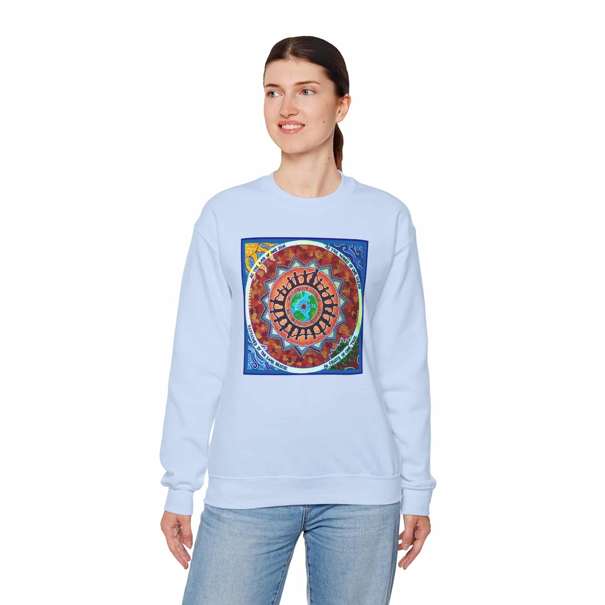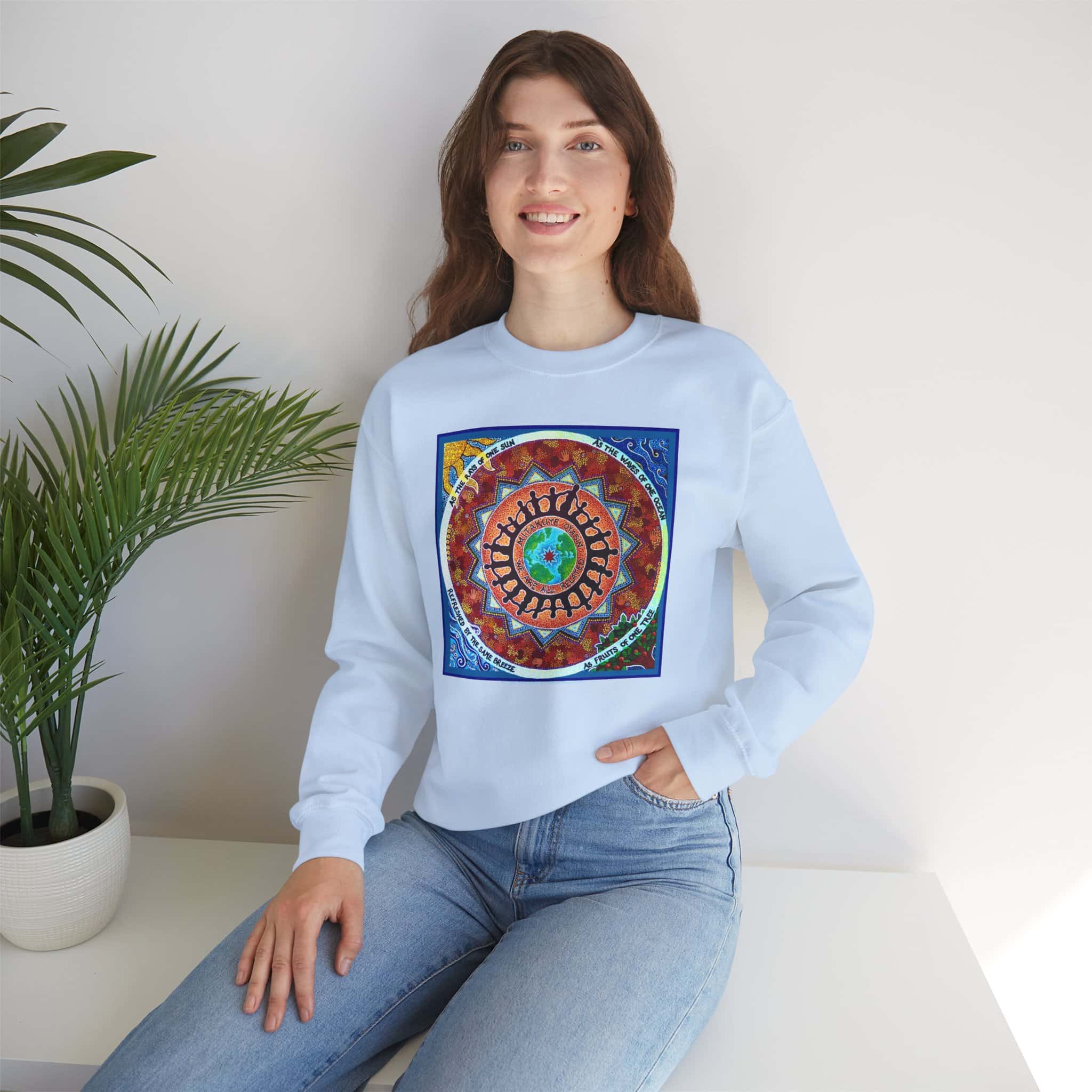 This engaging artwork by Charity Hofert includes the phrase “We are all related” in both English and the Lakota Sioux language. Around the edge it says “As the rays of one sun, as the waves of one ocean, refreshed by the same breeze, as fruits of one tree.”